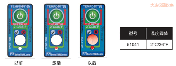 TempDot™ Minus標簽需存儲在室溫下,并且必須在反應溫度 以上被激活。激活是通過用手指推壓,標簽 底部的小窗口變?yōu)榧t色或部分變紅色以指示激活,但激活后并不需要保持紅色。當使用了上述反應溫度 標簽的產品暴露于閾值以下的溫度,,白色的大窗口變?yōu)榧t色或部分紅色,,在反應溫度 以上將溫度標簽用 于產品。如果一個產品暴露于閾值以下的溫度,,白色的大窗口變紅色或部分紅色,TempDot™ Minus標簽 提供即時的視覺指示。為達到最佳效果,,標簽應保持垂直位置,,其反應期間,紅色箭頭須指向上方。
