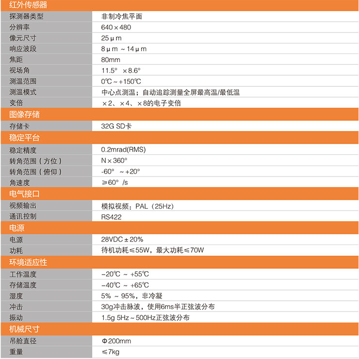 產(chǎn)品特點 體積小重量輕 直徑200mm,紅外熱像儀圖像,重量7kg,遠紅外熱像儀,大大降低飛機有效負荷 640x480高分辨率紅外熱成像儀 分辨率高,醫(yī)學紅外熱像儀,可清晰分辨出輸電線路發(fā)熱故障點 跟蹤精度高穩(wěn)定性好 采用陀螺穩(wěn)定平臺,進口紅外熱像儀廠家,可有效隔離運動載體的各種振動、起伏、 顛簸,消除圖像的模糊和晃動 視頻實時回傳 高空視頻可實時回傳至地面指揮中心,提高巡線效率 可拍照錄像 配置32G內(nèi)存卡,醫(yī)療用紅外熱像儀,可對觀測點拍照錄像,便于地面對故障進行分析 提供標準的通訊接口 標準的通訊接口,紅外熱像儀產(chǎn)品,方便與無人機、直升機等載體通訊,紅外熱像儀焦距,安裝調(diào)試方便