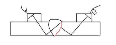 圖 1 對接焊焊縫余高未磨平、只能單面探測?墒褂眯碧筋^、觀察一次或二次回波在焊縫兩側(cè)進行掃查探傷。
